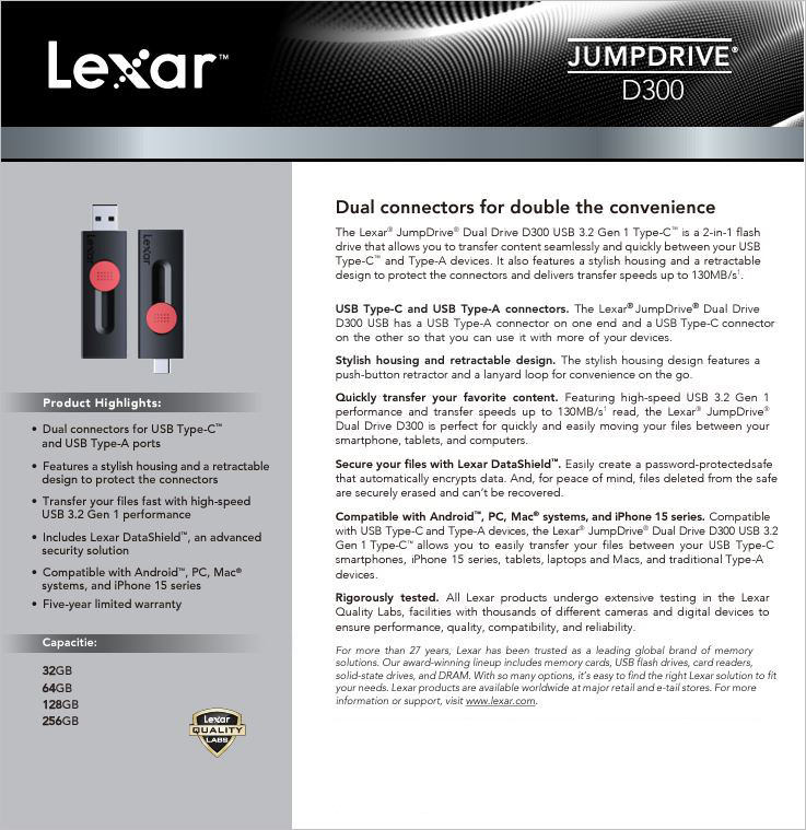 Lexar D300 JumpDrive Dual Drive USB 3.2 Type-C – 32GB / 64GB / 128GB / 256GB