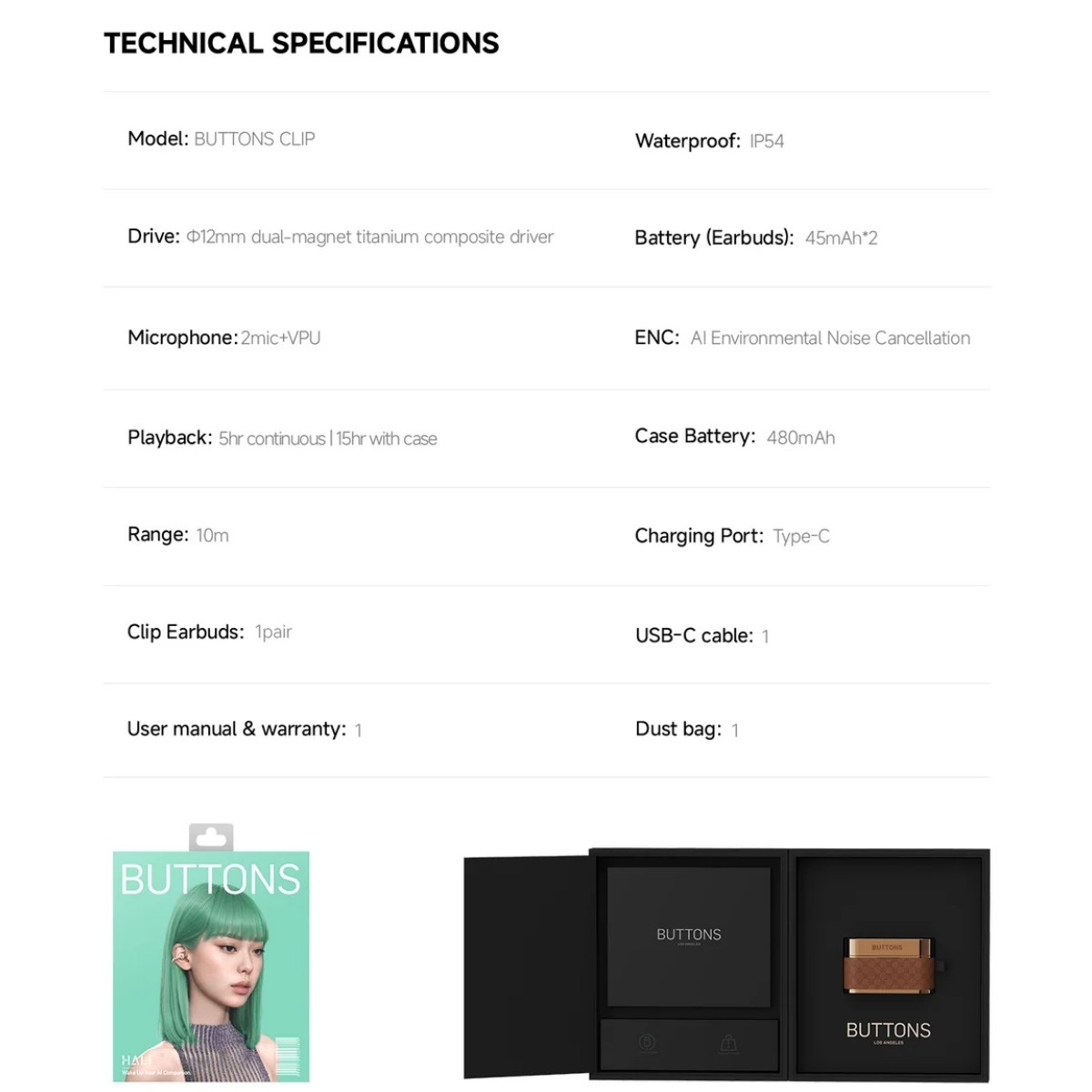 BUTTONS Clip Open-ear earbuds 12mm Titanium Driver Dual beamforming Mic Reduce wind & ambient noise
