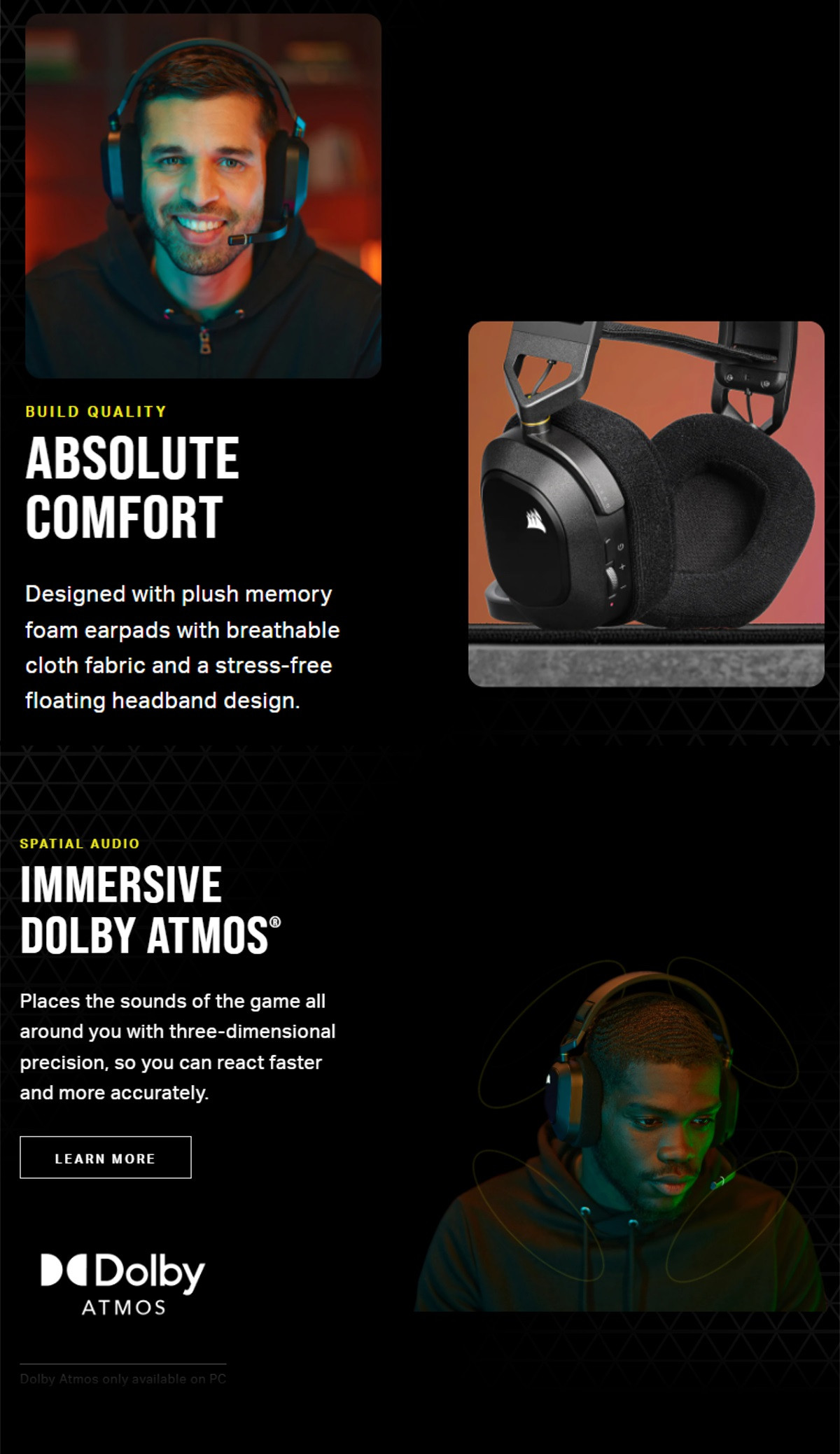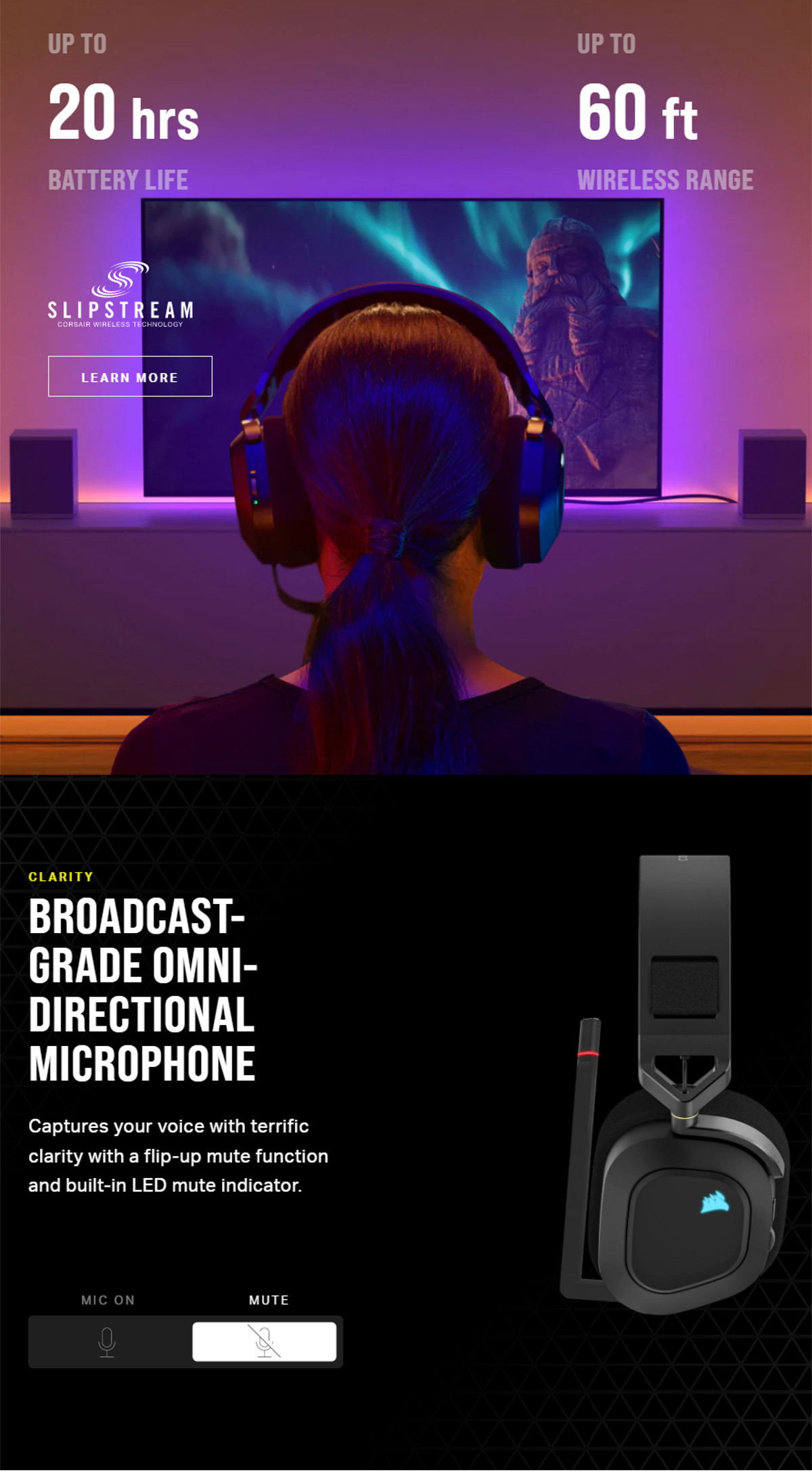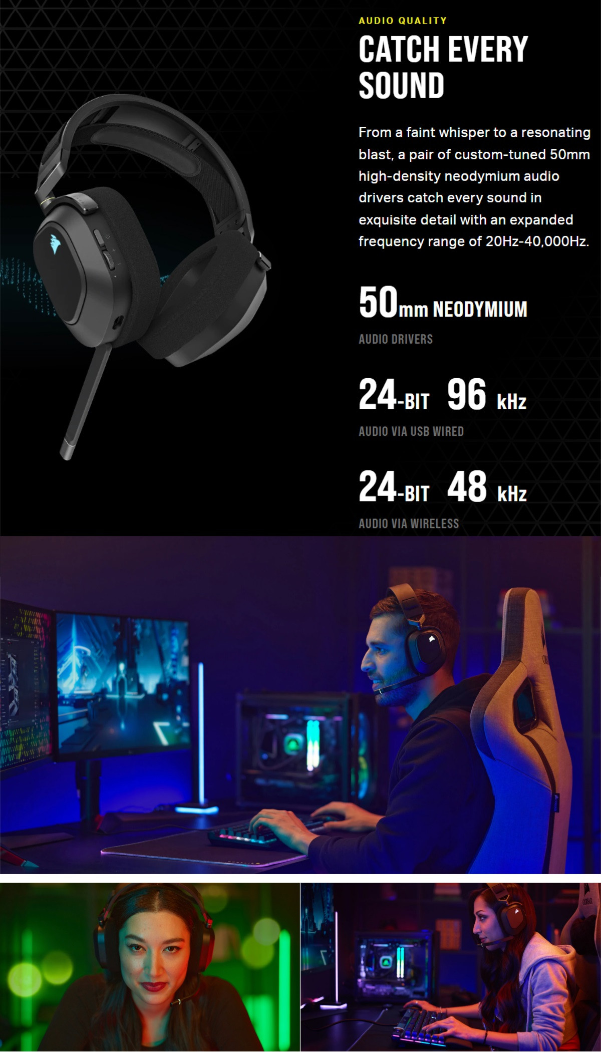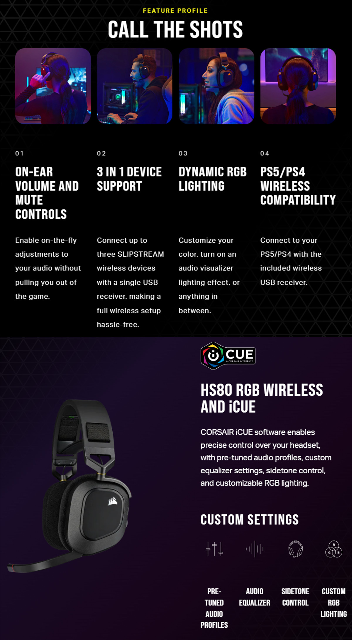 Live the Game: The HS80 RGB WIRELESS merges iconic CORSAIR design, superb audio quality, industry-leading wireless technology, and durable build quality.