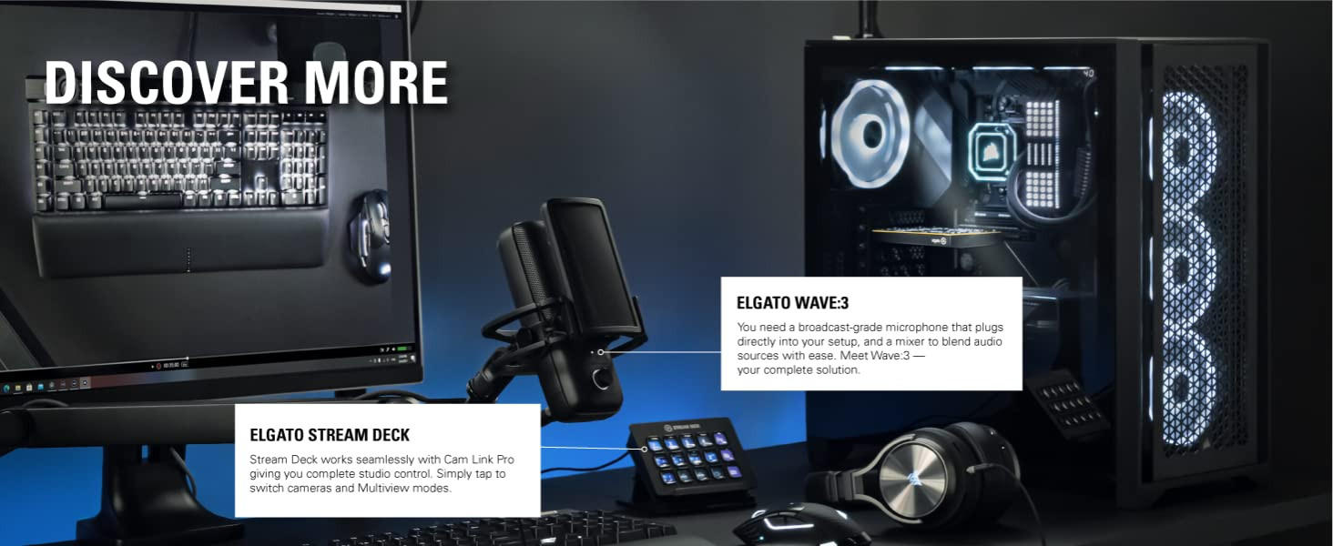 The Elgato Cam Link Pro is a powerful video mixer engineered for multi-cam productions. The Cam Link Pro allows you to capture four HDMI signals with ease and flexibility. Whether it's camcorders, DSLRs, action cams, or mobile devices, the Cam Link Pro can capture a clean HDMI signal in 4K @ 30 fps or 1080p @ 60 fps. You can also connect other computers to add plug-and-play content to your mix. The four HDMI inputs appear as separate devices in the encoding software of your choice. This allows you to position, resize, and customize each video feed. With four HDMI inputs and Multiview, you'll look professional during your conference calls, digital creative pitches, and more.