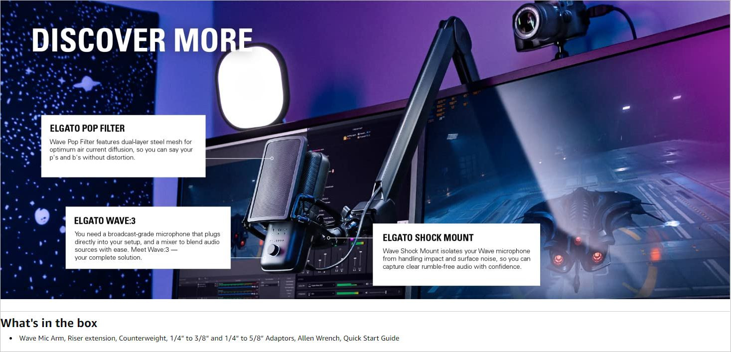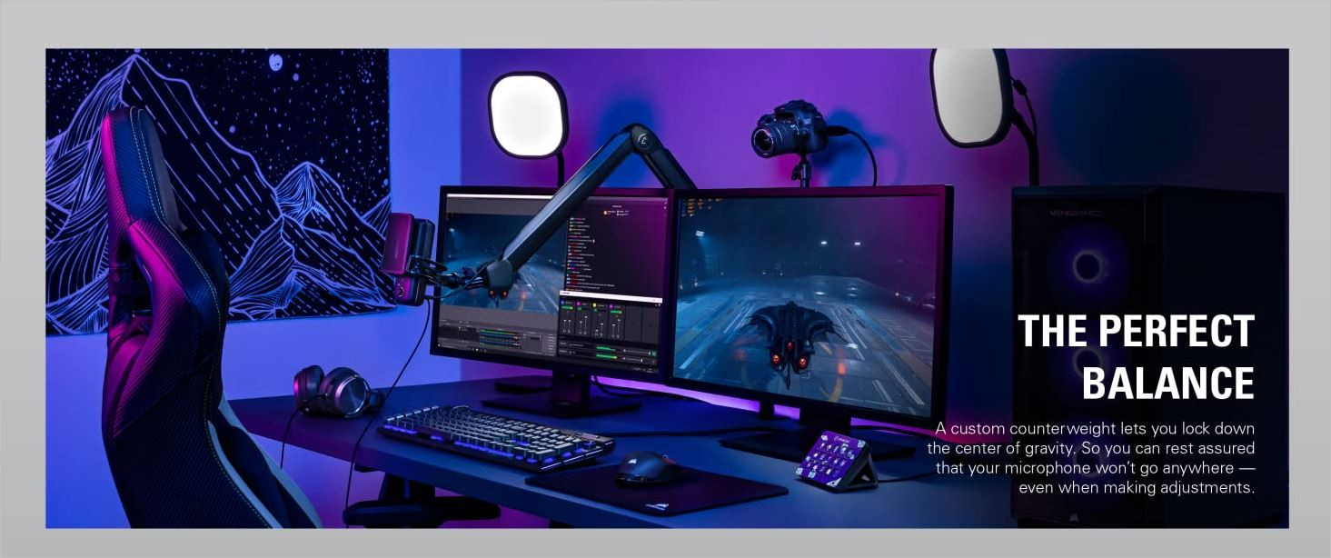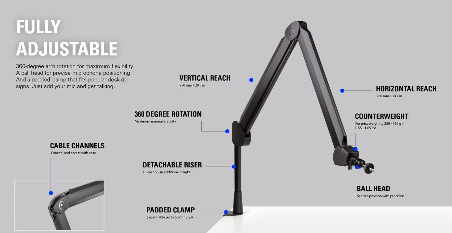 The Elgato Wave Mic Arm is a two-section suspension boom arm designed for flexible desktop microphone positioning for broadcasting, podcasting, gaming, and voiceover recording applications. The arm attaches to your desk via a padded clamp that expands up to 2.4". The arm rotates 360 degrees and features a maximum reach of 30.7" (78cm) horizontally and 29.5" (75cm) vertically. A riser extension is also included that adds another 5.9" (15cm) in height when employed.
