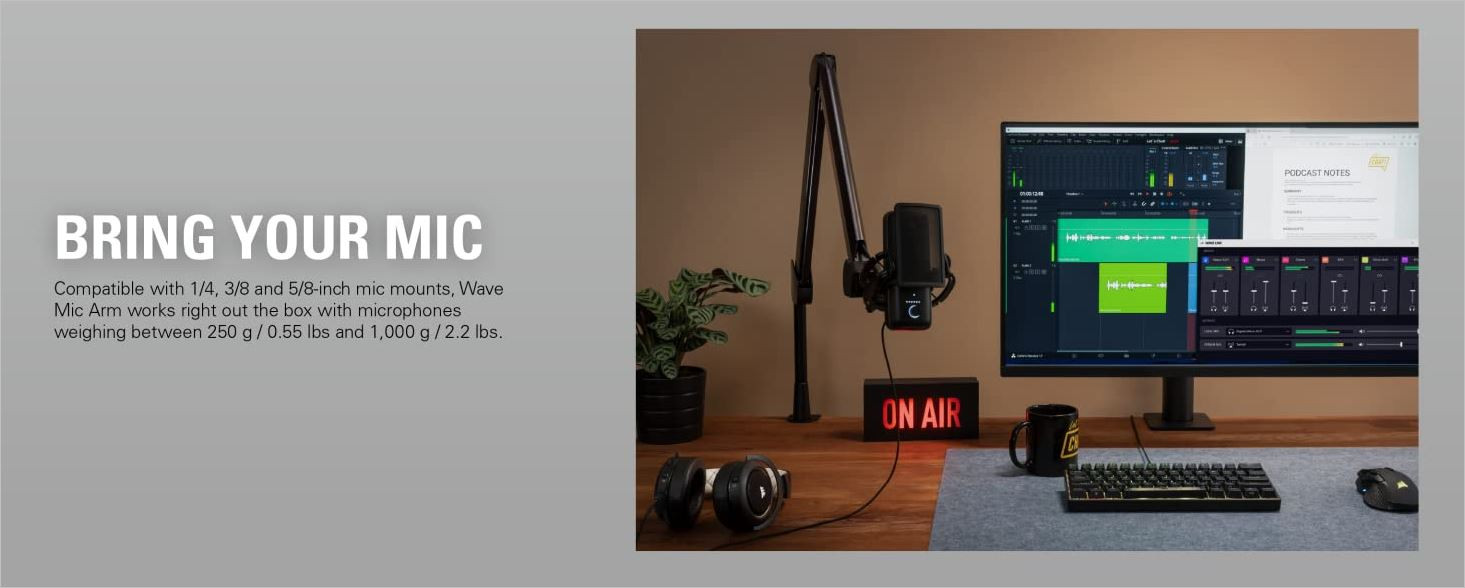 The Wave Mic Arm will accommodate mics weighing from 0.55 to 1.65 lb (250 to 748g), and a counterweight is included for use with lighter microphone models. A ball head provides precise positioning for your mic while the arm's cable channel makes it easy to conceal your XLR cable for a neat and professional appearance.