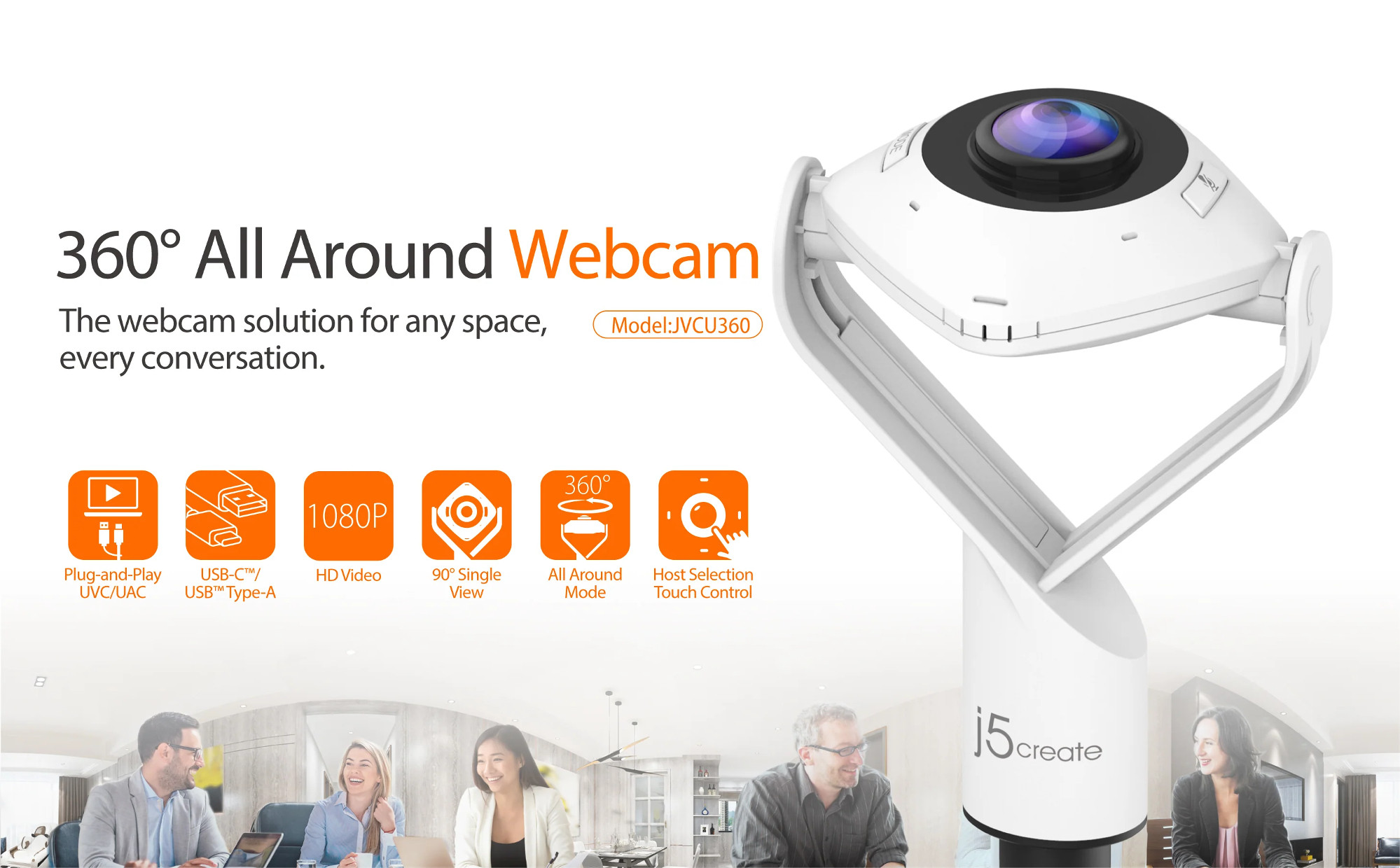 Enhance your conference calls with the 360° All Around Webcam. This all-in-one virtual meeting device combines HD video with business-grade audio clarity, to help run your video conferences smoothly. This high-definition, plug-and-play webcam, is ideal for any space. Capture a 360° panoramic view of the room or focus on specific presenters with the various display modes. The 360° All Around Webcam is equipped with a USB-C® cable and a USB™ Type-A connector to work with both your older and newer devices.