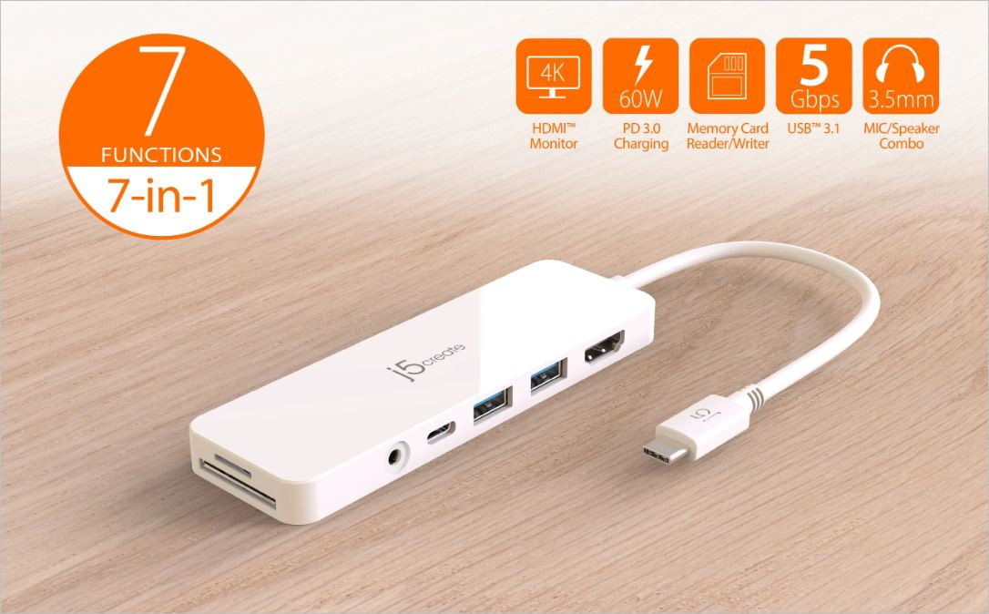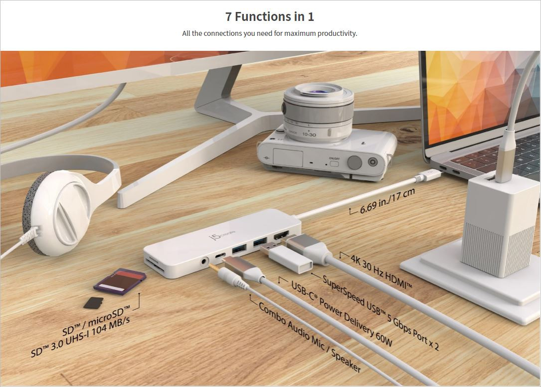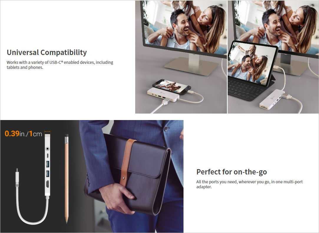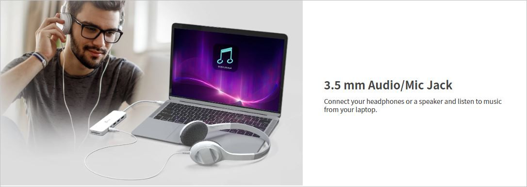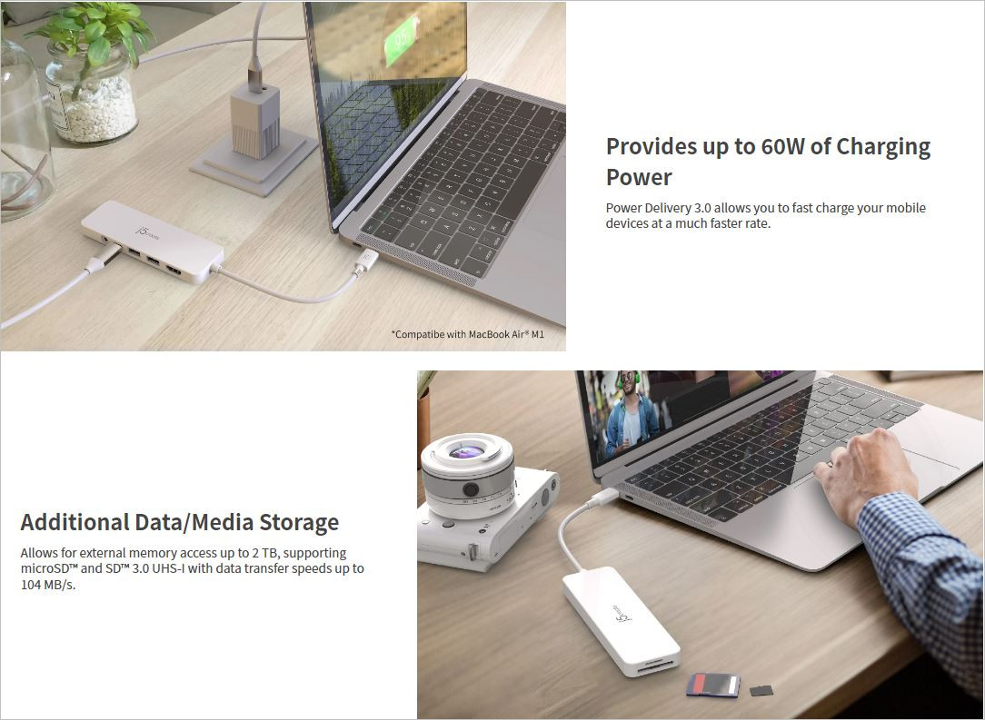 Equipped with a USB-C® Power Delivery 3.0 charging port. It offers charging up to 60W when connected to a USB-C® power adapter. The hub also provides direct access to your SDTM & microSD memory cards. The audio/mic combo jack allows you to connect your headphone set or speakers.