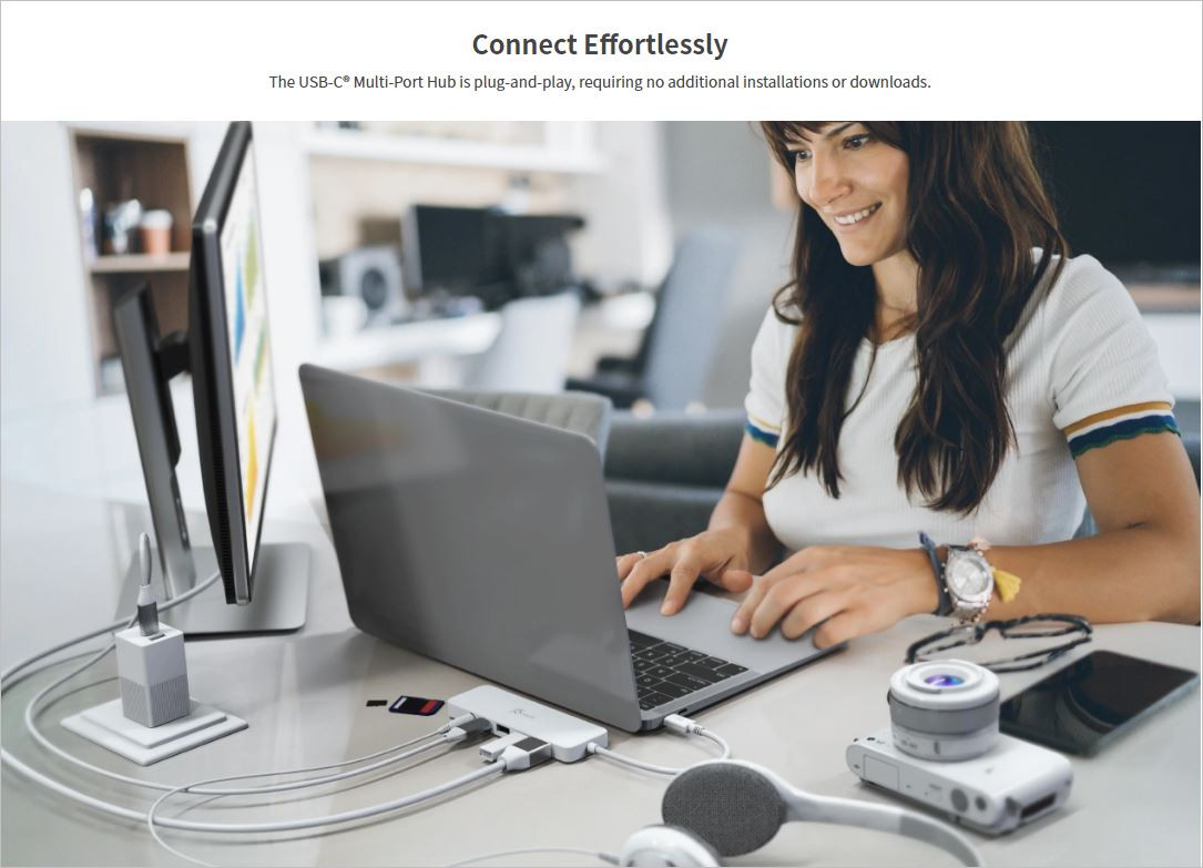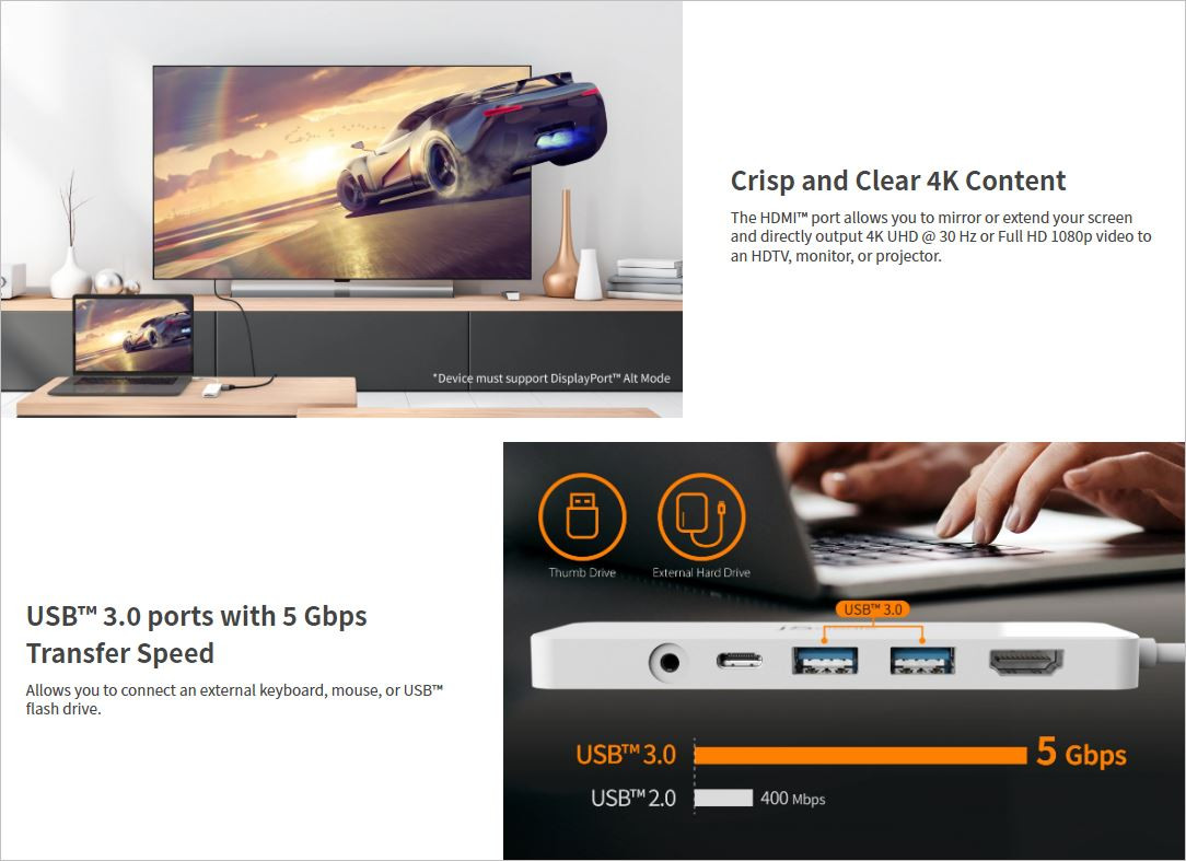 Our USB-C® Multi-Port Hub with Power Delivery provides extra connectivity for your computer. This pocket-sized multi-adapter with 2 USB 3.1 Type-A ports allows you to connect an external keyboard, mouse, or USB flash drive. With high-speed transmission up to 5 Gbps, data transfer is quick and easy. The HDMI port allows you to mirror or extend your screen and directly output 4K UHD @ 30 Hz or Full HD 1080p video to an HDTV, monitor, or projector.