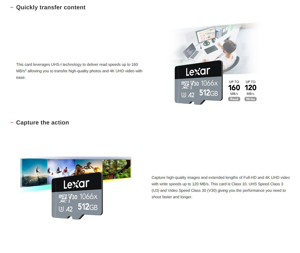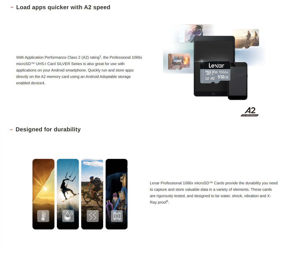 Aside from support for UHS-I, V30, and U3, Lexar also built this card with support for the Application Performance Class 2 (A2) spec, which includes optimizations to give Android users an improved mobile experience, delivering faster mobile app performance. The A2 spec allows the card to manage random read input-output access per second (IOPS) operations so it can quickly open apps and process accompanying tasks, such as audio, graphics, saved profiles, and in-app permissions.