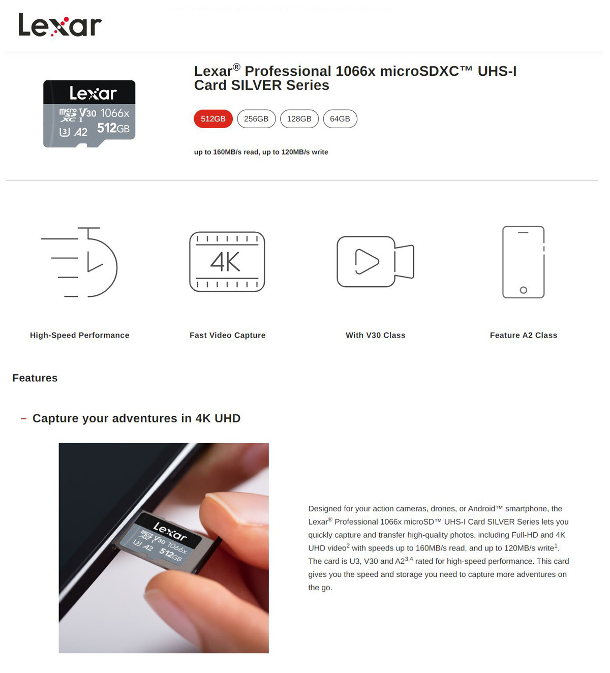 Designed for action cameras, drones, and Android smartphones, the 64GB Professional 1066x UHS-I microSDXC Memory Card from Lexar features a storage capacity of 64GB and supports maximum read speeds of up to 160 MB/s and maximum write speeds of up to 70 MB/s. This card has also been designed with the V30 Video Speed Class rating, which guarantees minimum write speeds of at least 30 MB/s. All of this provides the speed and storage you need to capture more adventures on the go.