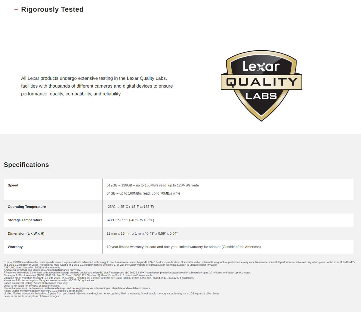 Lexar Professional microSD Cards provide the durability you need to capture and store valuable data in a variety of elements. These cards are rigorously tested, and designed to be resistant against water, shock, vibration, and x-Rays.
