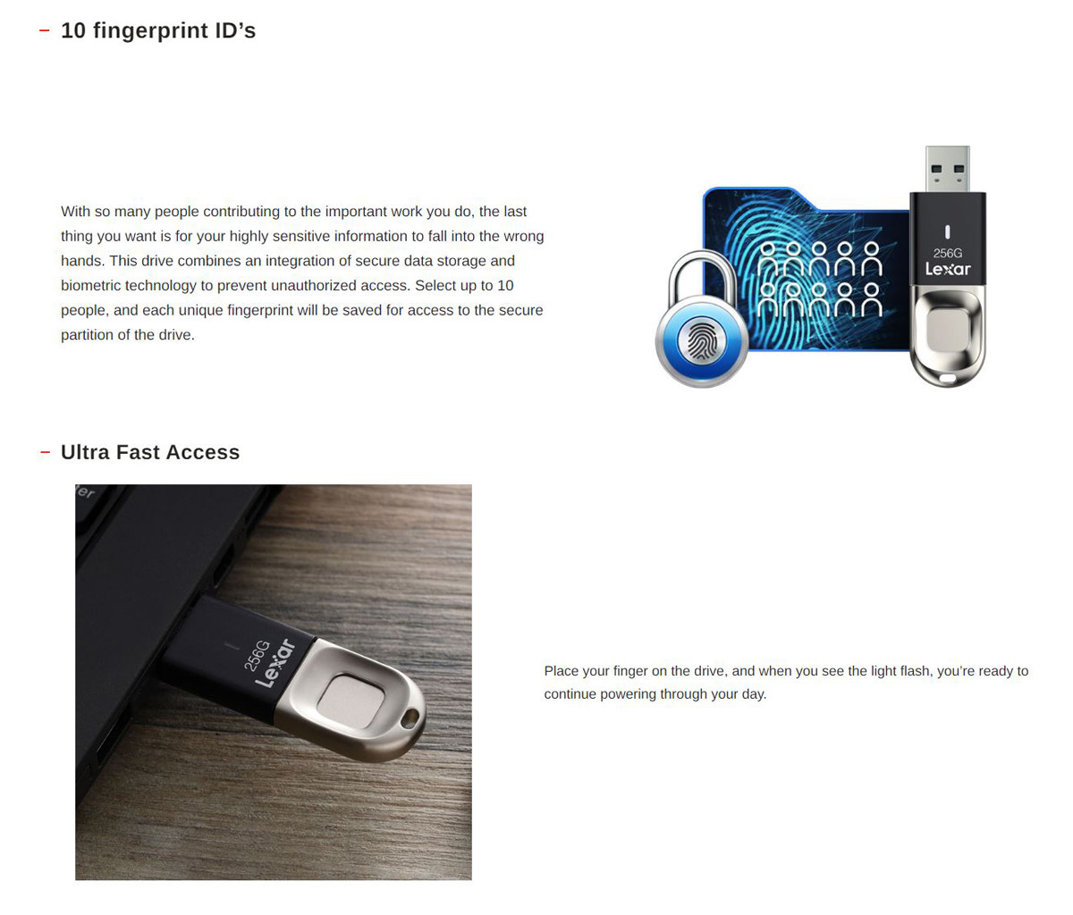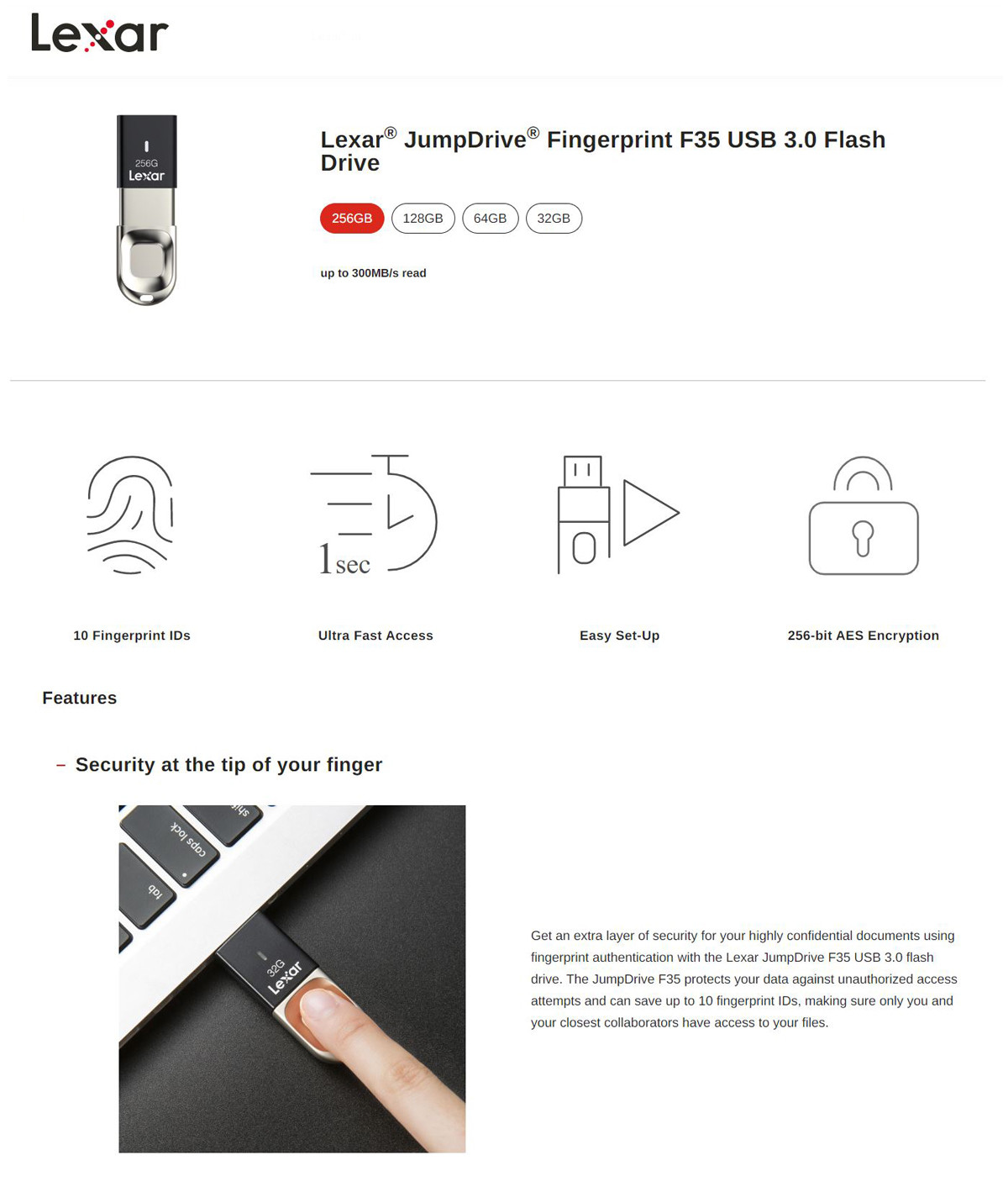 One of the most secure USB 3.0 Flash Drives available, Lexar JumpDrive F35 uses an ultra-fast fingerprint authentication that allows you to protect your data against unauthorized users – in under one second. The F35 can save up to 10 fingerprint IDs, making sure only you and your closest collaborators have access to your files. It also boasts an easy set-up with no software driver required, so you can quickly start transferring your files with speeds up to 150MB/s (1). And for added peace of mind, it also features 256-bit AES encryption to protect your valuable files.