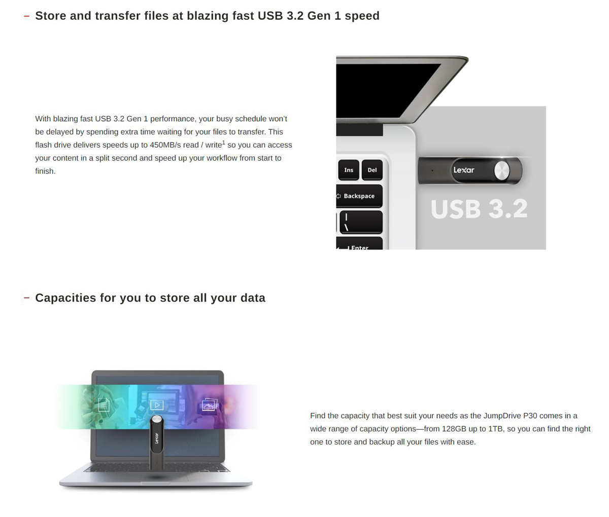 Store data and take it on the go with the P30 JumpDrive from Lexar. This plug-and-play flash drive features a USB 3.2 Gen 1 interface and supports data read and write speeds of up to 450 MB/s, making it easy to manage large file sizes, such as 4K multimedia content, photos, documents, and more. In addition to saving your files, the P30 JumpDrive offers 256-Bit AES encryption.