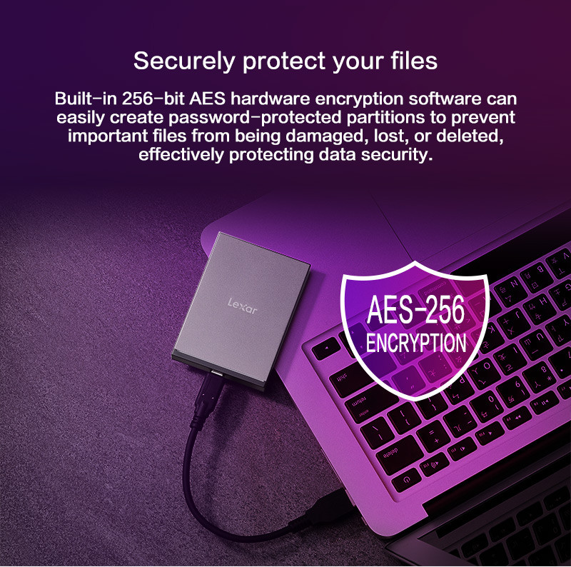 High performance meets style in Lexar SL210 Portable Solid State Drive 1TB SSD up to 550MB/s read. This SSD is made with anodised aluminium with a fine sandblasted grey finish. It features a huge storage capacity of 1TB with fast read and write speeds of up to 550MB/s and 450MB/s, respectively. This SSD is also equipped with a 256-bit AES encryption software solution for data protection. Moreover, it can withstand harsh temperatures, shock, vibration, and drop. It has also an LED indicator for file status transfer. This SSD is perfect for those who need to save high-resolution stills and moving.