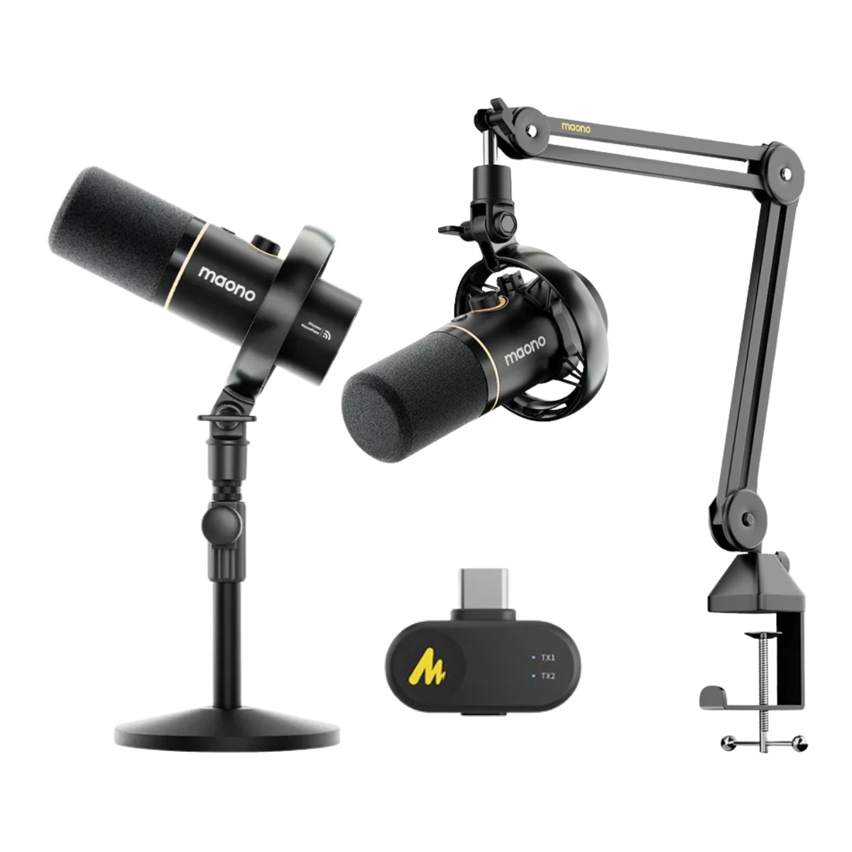 The Maono PD200W Hybrid Wireless Podcast Microphone is a versatile dynamic microphone for podcasting, streaming, gaming, and content creation. It features hybrid connectivity with 2.4GHz wireless, USB-C, and XLR, making it compatible with computers, smartphones, audio interfaces, and mixers.