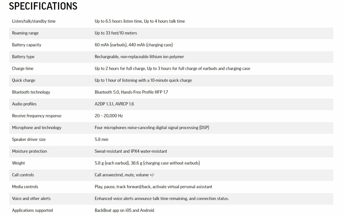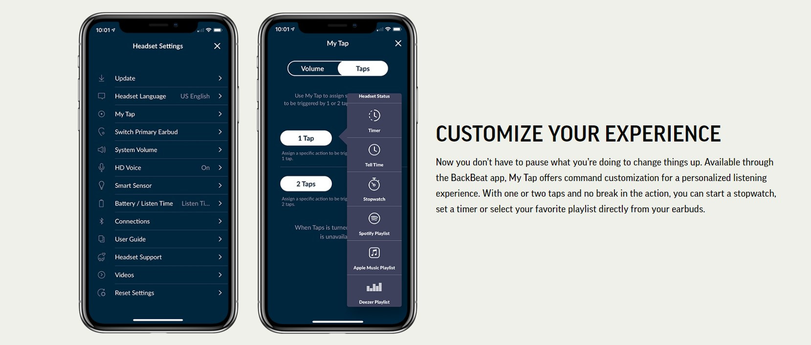 Now you don’t have to pause what you’re doing to change things up. Available through the BackBeat app, My Tap offers command customization for a personalized listening experience. With one or two taps and no break in the action, you can start a stopwatch, set a timer or select your favorite playlist directly from your earbuds.