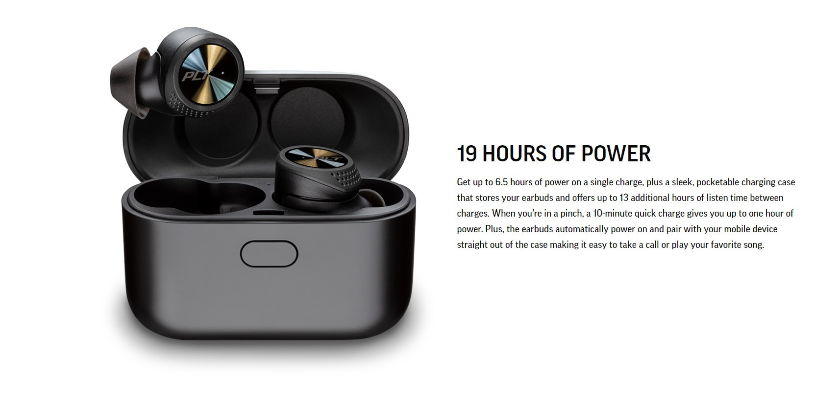 Get up to 6.5 hours of power on a single charge, plus a sleek, pocketable charging case that stores your earbuds and offers up to 13 additional hours of listen time between charges. When you’re in a pinch, a 10-minute quick charge gives you up to one hour of power. Plus, the earbuds automatically power on and pair with your mobile device straight out of the case making it easy to take a call or play your favorite song.