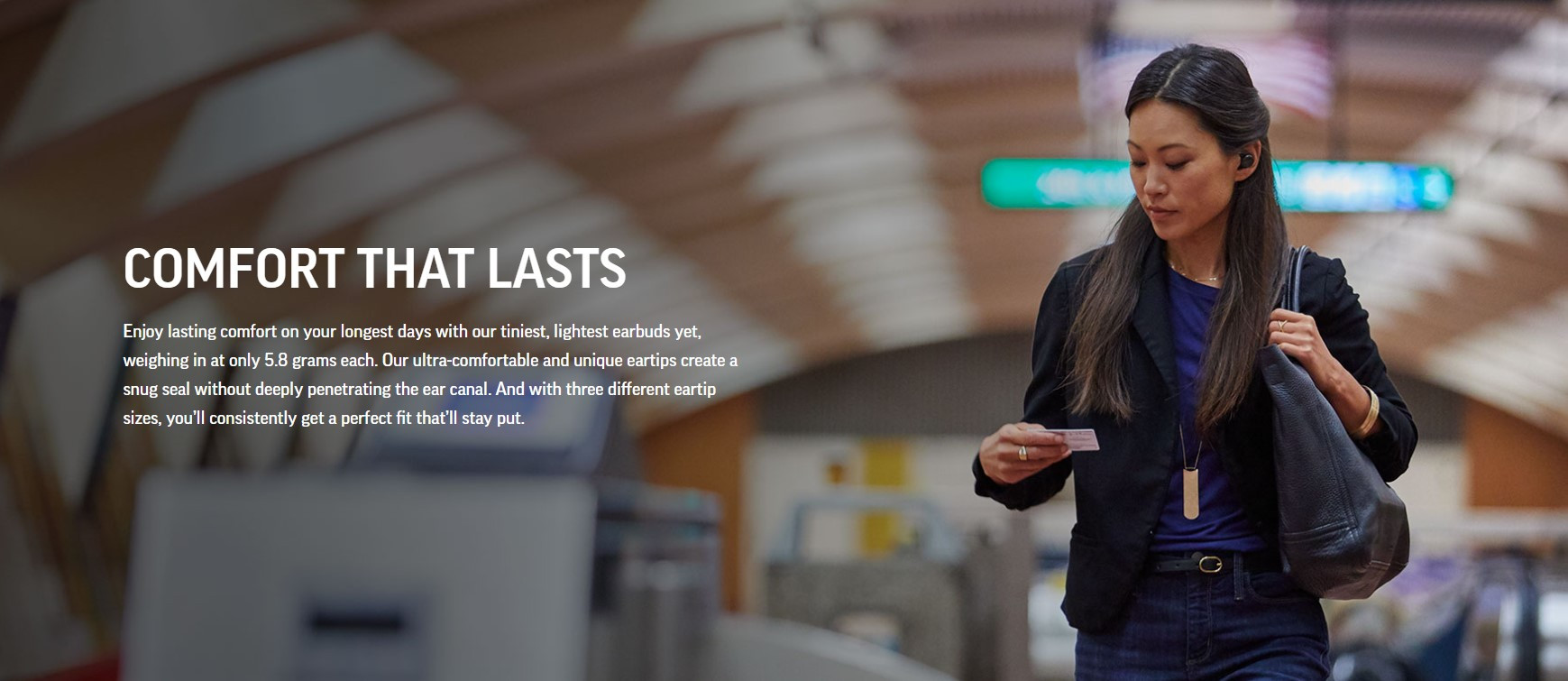 Enjoy lasting comfort on your longest days with our tiniest, lightest earbuds yet, weighing in at only 5.8 grams each. Our ultra-comfortable and unique eartips create a snug seal without deeply penetrating the ear canal. And with three different eartip sizes, you’ll consistently get a perfect fit that’ll stay put.