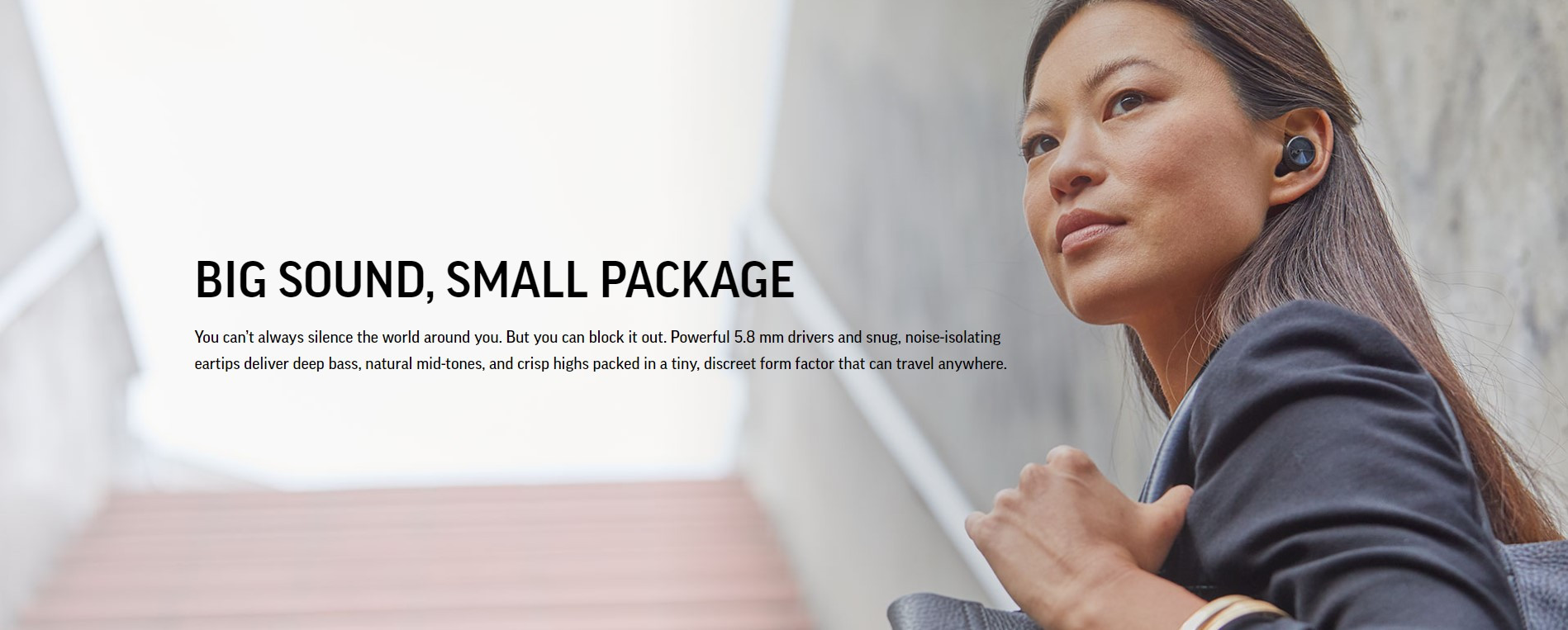 You can’t always silence the world around you. But you can block it out. Powerful 5.8 mm drivers and snug, noise-isolating eartips deliver deep bass, natural mid-tones, and crisp highs packed in a tiny, discreet form factor that can travel anywhere.