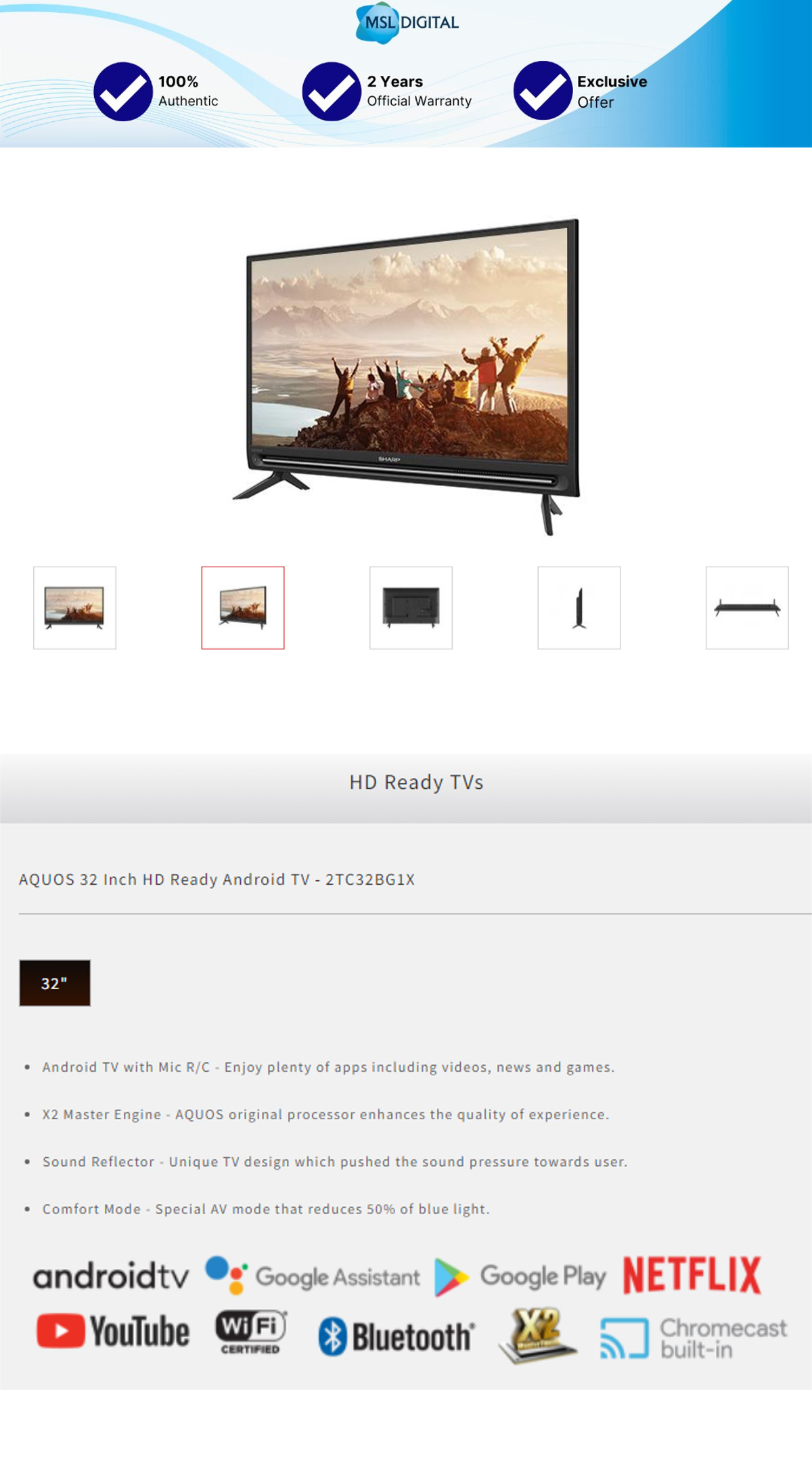 Sharp AQUOS 32 Inch HD Ready Android TV | X2 Master Engine | Sound Reflector – 2TC32BG1X